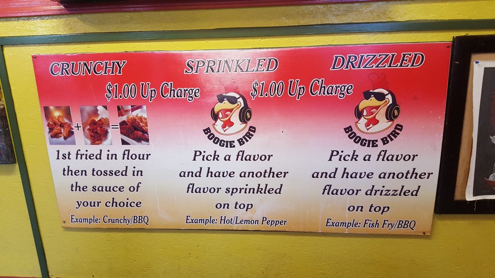 Comes with a cup of ranch upon request Please specify in special instructions if you choose to add an additional flavor. whether you would like it sprinkled or drizzled on top of another flavor or if u would like the second flavor on the side..(for example hot sprinkled lemon pepper) or ( chipotle which is a (DRY) flavor drizzled with bar b due sauce which is a (WET) flavor on top of the chipotle...or if u would rather the second flavor put in portion cups on the side.. adding a flavor on top of another flavor is an upcharge but it gives u the opportunity to mix flavors on your chicken and if u want them split.. please specify how u would like it ..(for example a piece half and half hot sprinkled lemon pepper. and the other half jerk with cajun ranch drizzled on top.. this is what makes us unique u can mix and match flavors for a small uncharge..if not sure please call store..
